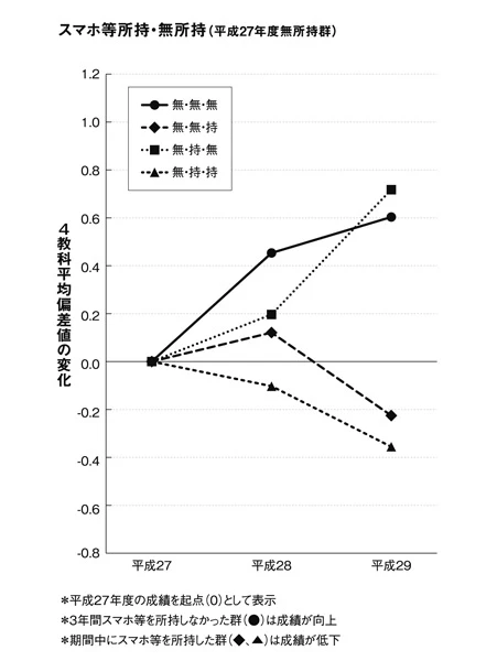 (1)「非使用」(スマホをずっと使用しなかった)(2)「導入」(途中からスマホを使用し始めた)(3)「中止」(当初はスマホを持っていたが、途中で使用するのをやめた)(4)「使用」(スマホをずっと使用し続けた)という4つのグループに子どもたちを分け、偏差値で生徒の学力の推移を追跡したのです。