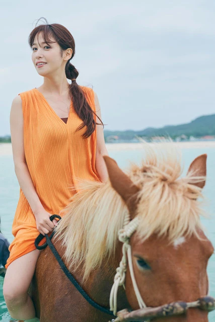 撮影はグラビアの聖地・沖縄本島と、久米島で敢行。非日常感あふれる解放的な写真の数々を収録し、飾らない生身の彼女に迫りました。360度の美しい海が広がる「はての浜」で波と戯れる姿、大好きな馬に乗って海の中を闊歩する勇ましい(?)様、食事どきの満面の笑顔、ホテルの朝、パジャマ姿での眠たげな表情......そのすべてが眩しく、愛おしく、癒される。