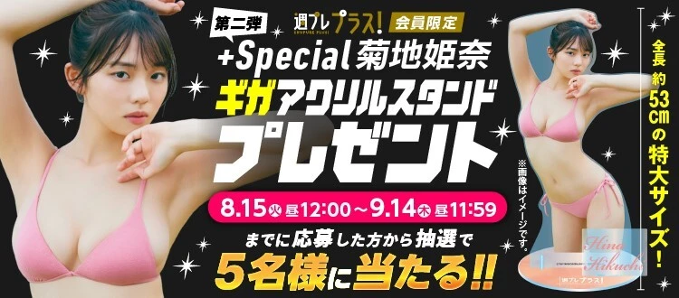 『週プレ グラジャパ!』のサブスクリプションメニュー『週プレ プラス!』では、菊地姫奈ちゃんの「+Special」2ヵ月連続登場を記念して、プラス!会員限定の抽選会を開催いたします。応募した方から抽選で、5名様に菊地姫奈ちゃんのギガアクリルスタンド(全長約53cm)をプレゼント!