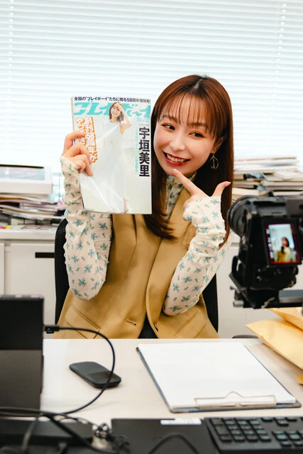 宇垣美里「私は普段SNSをやっていないので、ショート動画撮影はすごく新鮮な体験でした。撮影のために週刊プレイボーイの編集部に久しぶりにおじゃましましたが、いつ来ても『面白い会社だな』と思いますね、刺激的なお姉さんたちのポスターがいっぱい貼ってあったりして(笑)。
