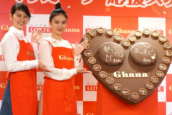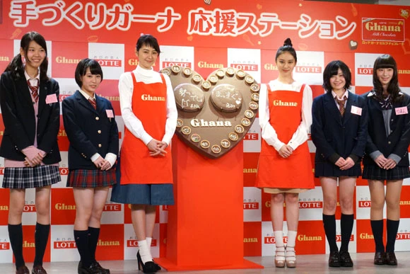 恋に悩める女子高生に恋愛テクを伝授する武井咲と長澤まさみ長澤まさみと武井咲が、6日に東京・原宿で行なわれたロッテ「手作りガーナ応援ステーション」オープニングイベントに出席した。