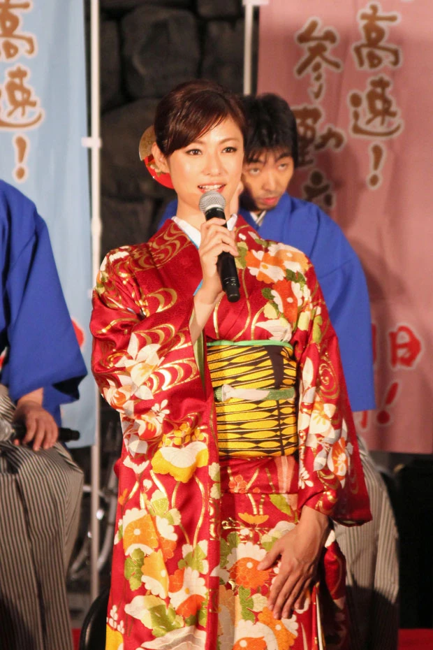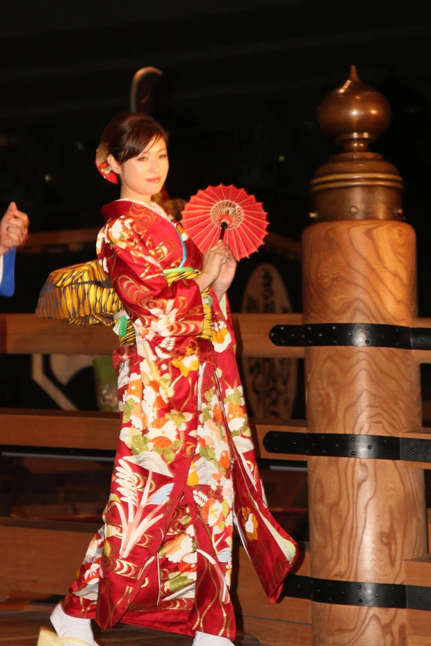 完成会見は参勤交代の際に渡られていた日本橋(江戸東京博物館内で復元された)で開催。男性陣は袴姿、紅一点の深田は着物姿で登場した