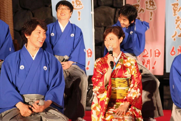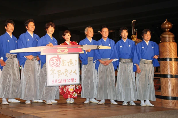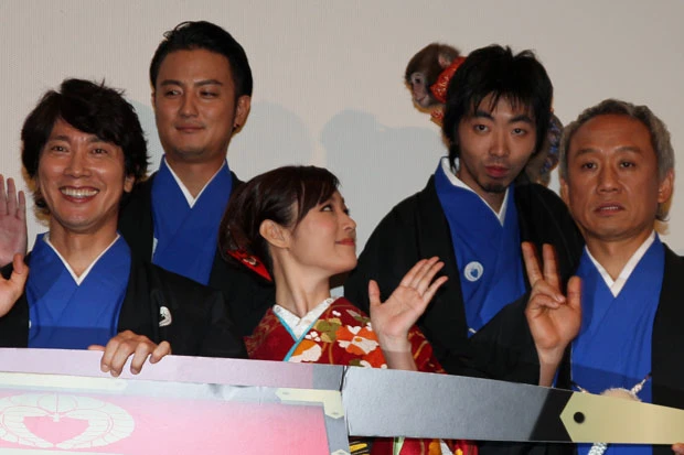 完成会見は参勤交代の際に渡られていた日本橋(江戸東京博物館内で復元された)で開催。男性陣は袴姿、紅一点の深田は着物姿で登場した27日、時代劇映画『超高速!参勤交代』の完成会見と完成披露試写会が行なわれ、佐々木蔵之介、深田恭子、伊原剛志、西村雅彦、寺脇康文、上地雄輔、知念侑李(Hey!Say!JUMP)、柄本時生、六角精児、本木克英監督、猿の菊千代(試写会のみ)が出席した。
