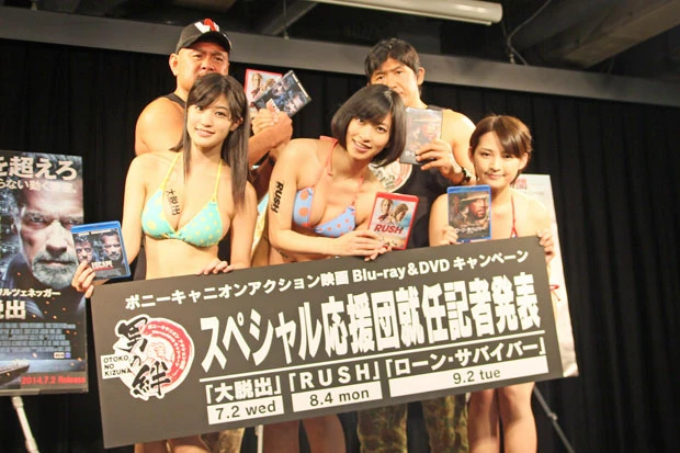 左からGカップの巨乳アイドル・高崎聖子、100cmのもっちりヒップで“尻職人”の倉持由香、スレンダーな体が美しい鈴木咲10日、「アクション映画ブルーレイ&DVDキャンペーン『男の絆』応援団就任記者発表」がポニーキャニオン本社で開催された。登場したのは、同社が設立したグラビア映画宣伝部の高崎聖子、倉持由香、鈴木咲のほか、武藤敬司と船木誠勝が結成した「男の絆」プロレスラー応援団。