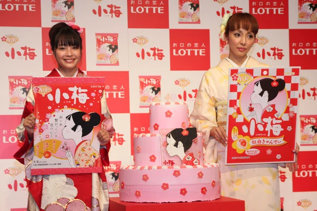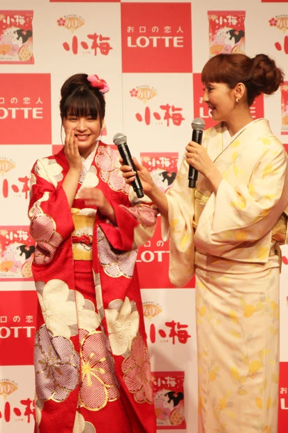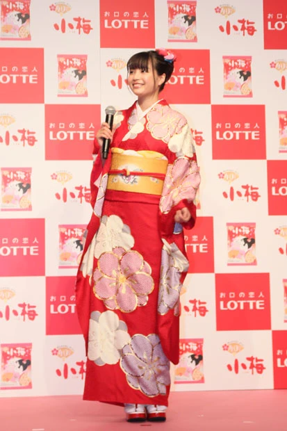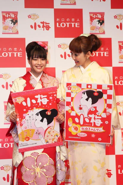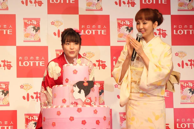 小梅ちゃんと同じ赤い着物で登場した広瀬。19日に16歳の誕生日を迎えるため、サプライズで巨大なバースデーケーキがプレゼントされた17日、都内で行なわれたロッテ「『小梅』40周年記念『小梅の恋叶えプロジェクト』発表会」に、タレントの神田うのと、「小梅」アンバサダーに就任した女優の広瀬すずが出席した。
