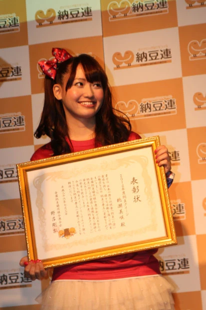 この日は表彰式のほか、6代目「ミス納豆」に就任した折原あやのと広瀬彩夏も今後のPR活動のため紹介され、納豆キャンペーンソング「なっとう大好き!」を歌う南場聖奈(なんばせいな)らも登場した。