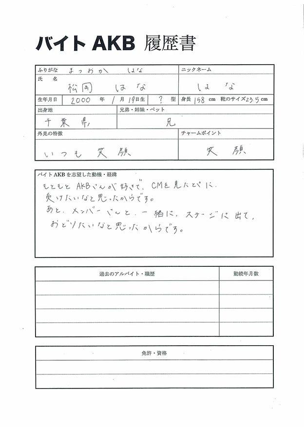 松岡はな2000年1月19日生まれ 千葉県出身ニックネーム=はな