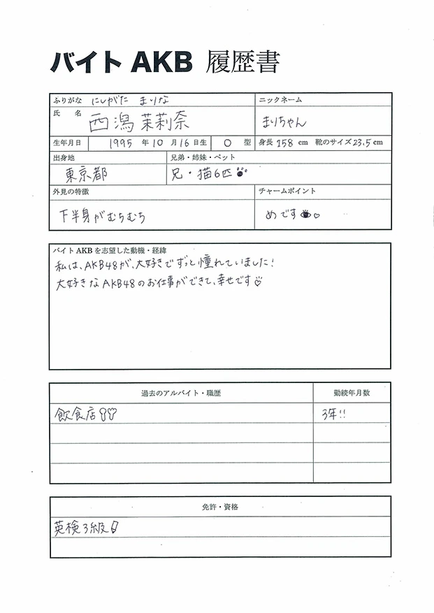 西潟茉莉奈1995年10月16日生まれ 東京都出身ニックネーム=まりちゃん
