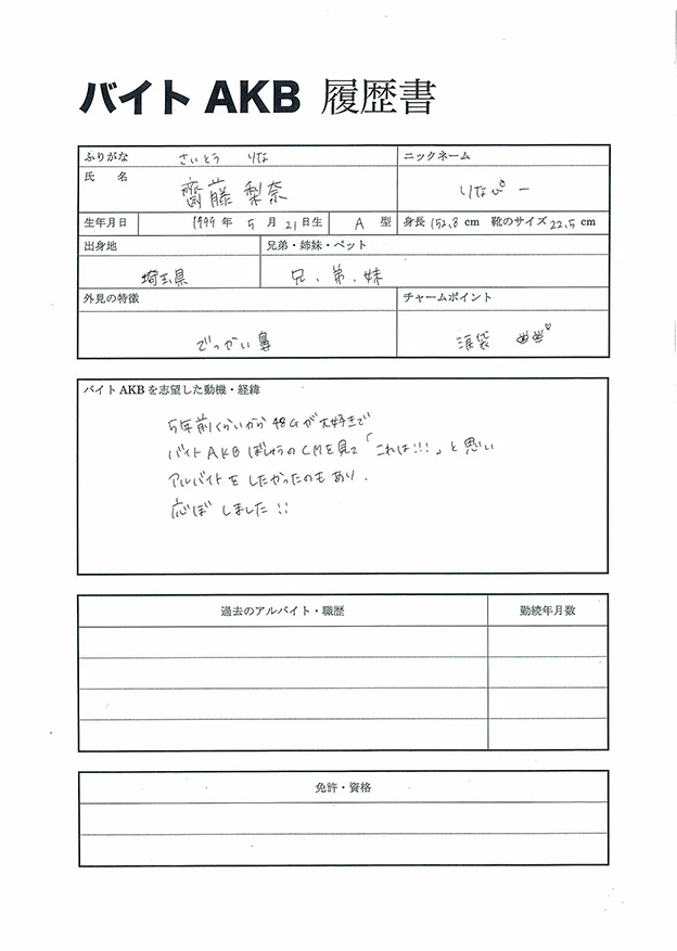 齋藤梨奈1999年5月21日生まれ 埼玉県出身ニックネーム=りなぴー