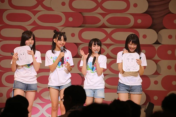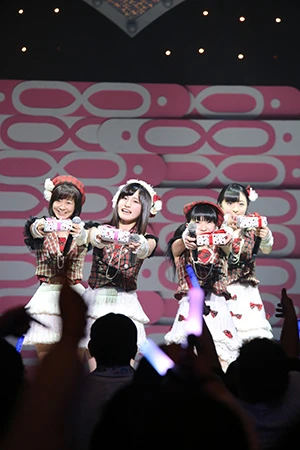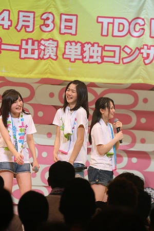 そしてライブもまもなく終了という時、センターに立つ中野の元へ、スタッフから押しボタンが渡される。何が起きたのか戸惑う中野をしっかり者の倉野尾成美が支え、ボタンを押すとメンバーの後ろに降りてくる垂れ幕…。そこには「2015年4月3日 TDC Hall 初の全メンバー出演 単独コンサート!」の文字が!
