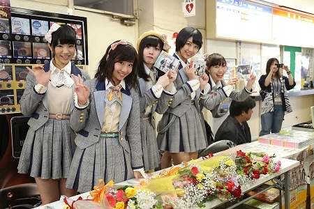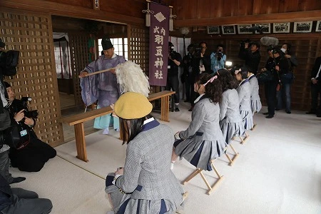 聖地・羽豆岬で同日発売の対決にも必勝を期すSKE48の5人SKE48が3月30日、愛知県の南知多町にある羽豆岬で17thシングル『コケティッシュ渋滞中』(3月31日発売)のヒットを祈願し、羽豆(はず)神社で玉串と絵馬の奉納を、師崎(もろざき)港観光センターでSKE48を応援する横断幕の除幕式を行なった。
