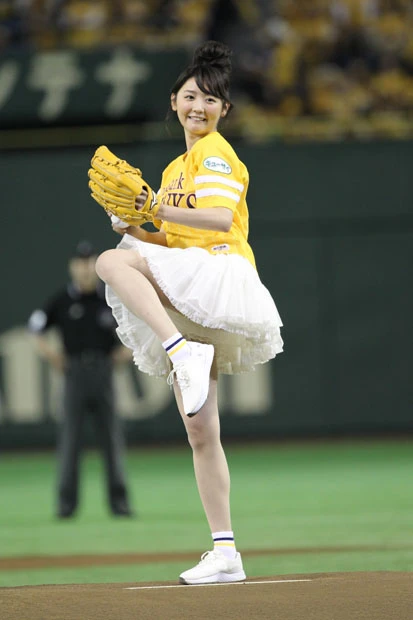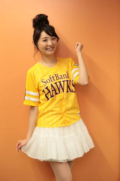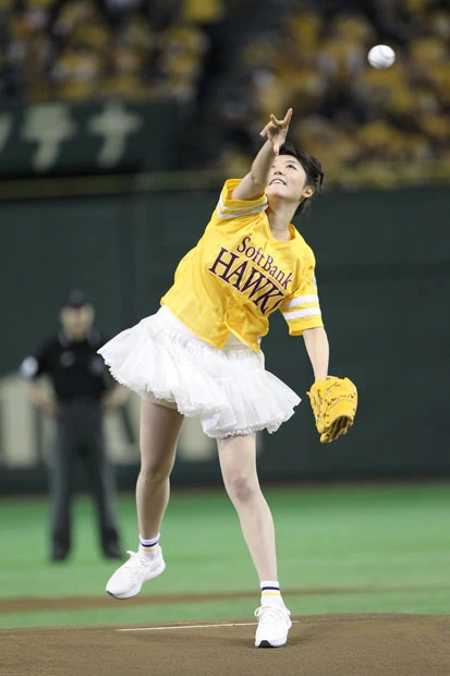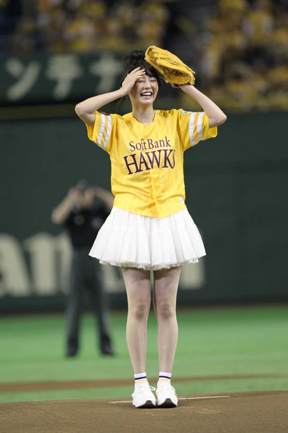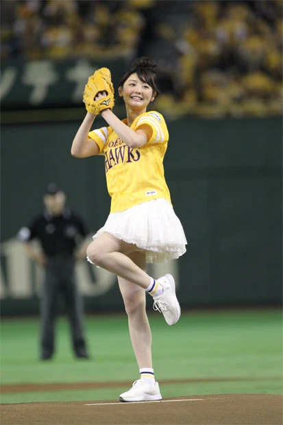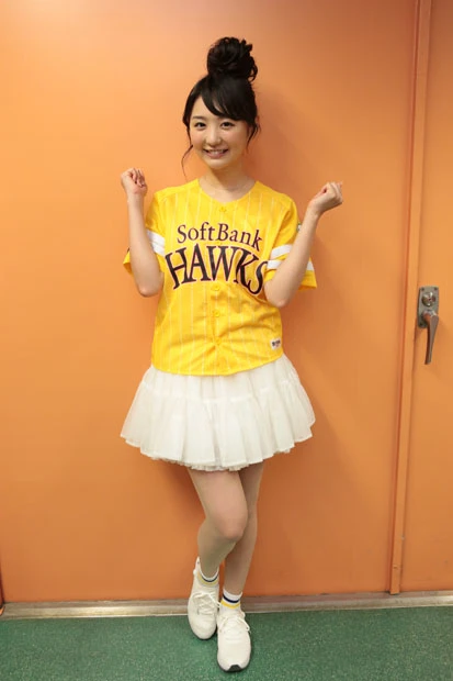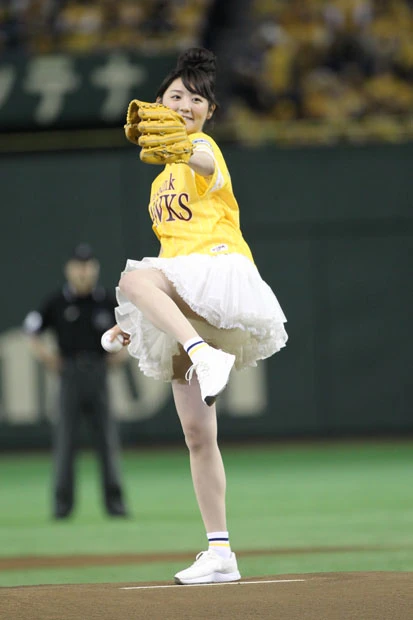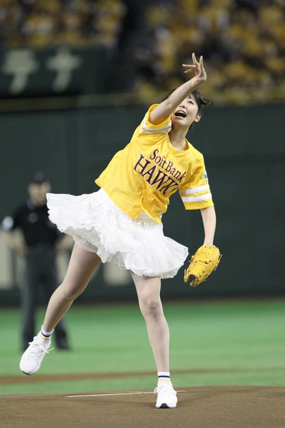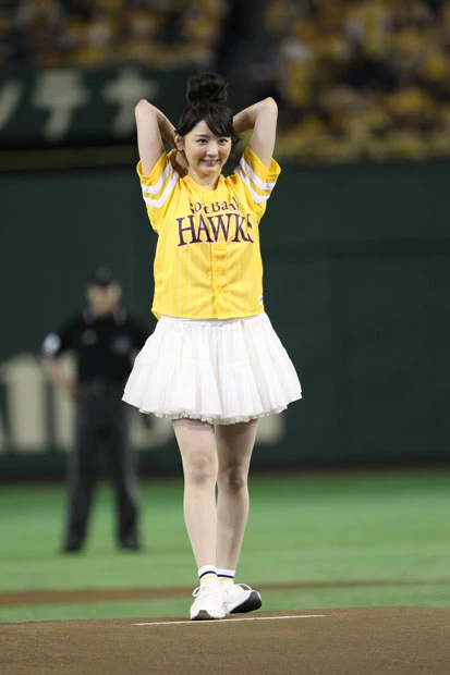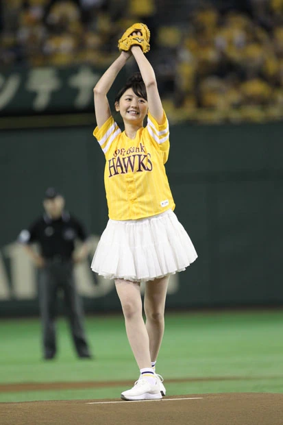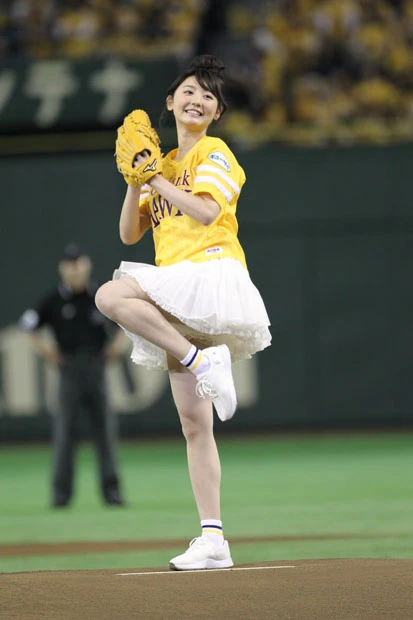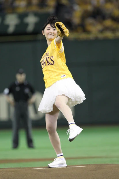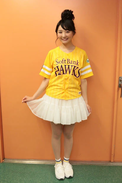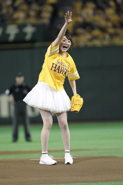 チアリーダーのダンスなどが終わり、ついにおのが登場。ファンと同じ黄色いユニフォームに白いミニスカートを履いた“鷹ガール”スタイルのおのは、マウンドに上がると両手で小さく手を振りながら笑顔を周囲に向ける。