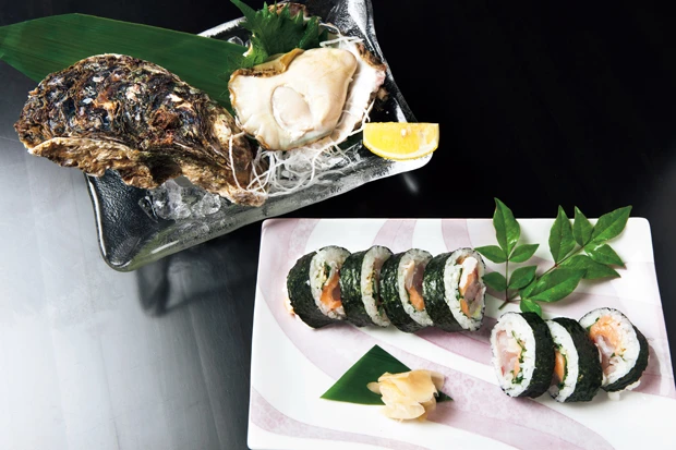 岩ガキ 700円~(税抜き)まかない巻 650円(税抜き)山陰地方の名産である岩ガキは、3月から8月中旬までが旬。値段は大きさによって多少変わるとか。まかない巻は、新鮮な魚介を食べやすいように刻んでノリ巻きに。この日は白バイ貝、サーモン、ヒラメ、タコ、アジが入っていた。