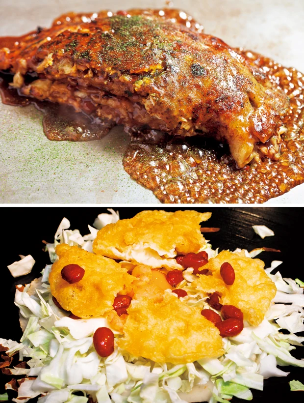 豆天玉はその名の通り、甘辛く煮た金時豆と小エビの天ぷらが入ったお好み焼き。それだけを聞くと味が想像できないかもしれませんが、金時豆のホクホク感と甘さ、天ぷらの歯応え、そしてソースのしょっぱさがマッチして絶妙な風味になるんです。私は広島育ちですが、そんな私でもナットクの味。ぜひ食べてください!