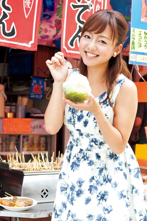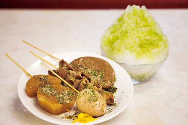 静岡おでん 1本90円 かき氷(まっ茶) 300円 静岡おでんの特徴は、黒いだし汁と、おでんの上に振りかける「だし粉」。しょっぱそうに見えて、実はアッサリしているのだ。そして静岡の名物といえば、やっぱりお茶。かき氷のまっ茶味は、甘いシロップに少し苦みが効いている大人の味!