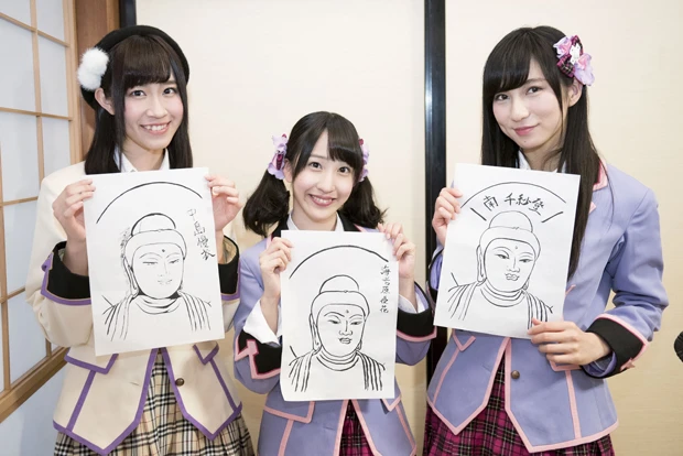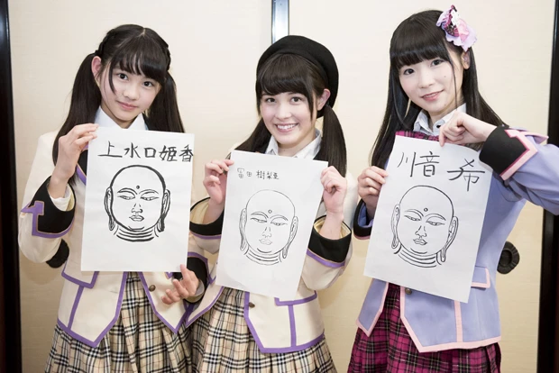 「マ イペースなミーアキャット系女子」、中島優衣も「3人は同じ仏さまを描いたのに、個性が出ていてちょっと違うんですよね。私はかなり集中して描きました。 メンバーの中には、話しながら描いているコもいたんで、もっと集中しなくちゃ、グラバカ!で戦うアップアップガールズ(仮)さんやdropさんに負けちゃ うなって思いました」と気を引き締めた。