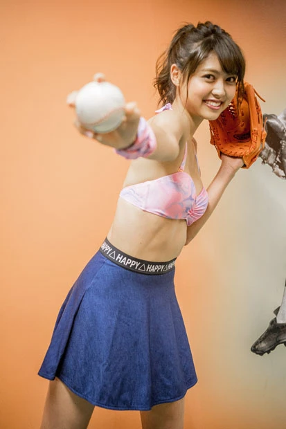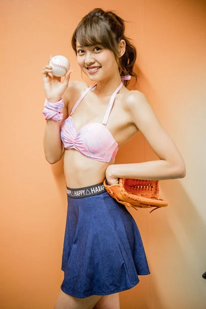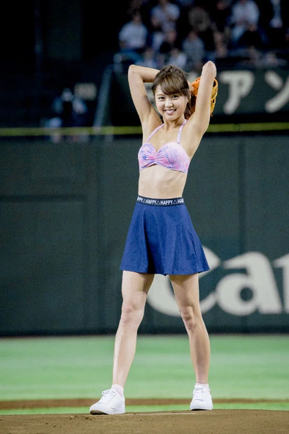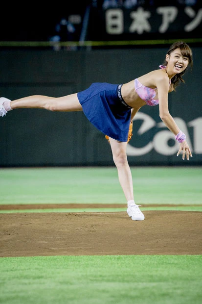 松元はピンクのビキニ姿でグラウンドに登場。露出も多く、身長168cm、W55のスレンダーなスタイルがひと際目立つ。球場スタッフも思わず「あのコ、細っ!」と呟(つぶや)き、目を奪われてしまうほど…。