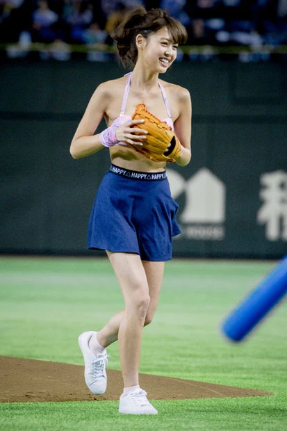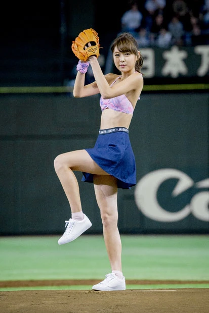 東京ドームという大舞台で、さらに初めての始球式ながら、タメにタメてボールにキスという虚を突くパフォーマンスで満員の観客にインパクトを与えるとは…大物すぎる!? そこで、週プレNEWSでは始球式を終えたばかりの彼女を直撃した!