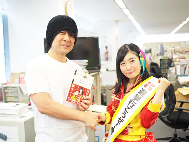「週プレNEWS」貝山編集長(左)と気勢を上げる、桜雪ちゃん