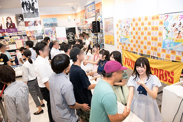 17時半を回り、「お渡し握手会イベント」が始まると、ステージの衣装に着替えた6人が再び登場。150名ほどの来場者全員を相手にそれぞれ順番に握手。