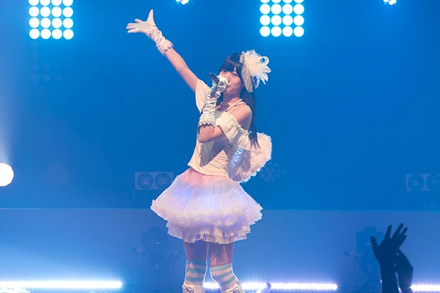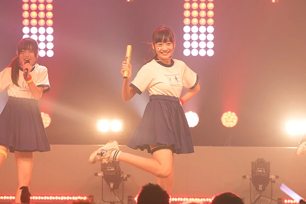 選んだ曲は、デビューシングルのカップリング曲『嘘つきなボクたちは』。どこか初々しさを感じる振り付けで、淡いブルーのワンピースがふわりと揺れる。ピアノの旋律が響く、爽やかな1曲だ。普段から笑顔いっぱいの朝日だが、ライブ中もその笑顔をたやすことはなかった。歌い終わってから「1番目だからって忘れないでくださいよー!」とかわいい捨て台詞を残した!