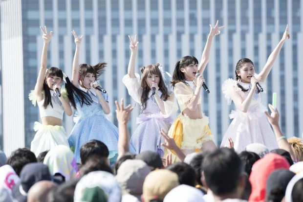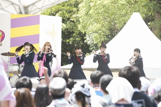 真っ青な空の下に現れた5人組。見た瞬間にわかるルックスの良さ! リーダーのさとれなの仕上がり感。さらに、小山リーナと清水ひまわりの中学生コンビの可愛らしさに目が行く。『Magiかよ?BiliBili☆パンチライン』から始まり、『Prologueは摩訶不思議』へ…。腕を大きく振る、スカートが揺れる。アニメの魔法少女主題歌のような楽しさだ。5人ともふくらはぎが細い。二の腕が細い。まさに魔法少女のような2次元感たっぷりだ。