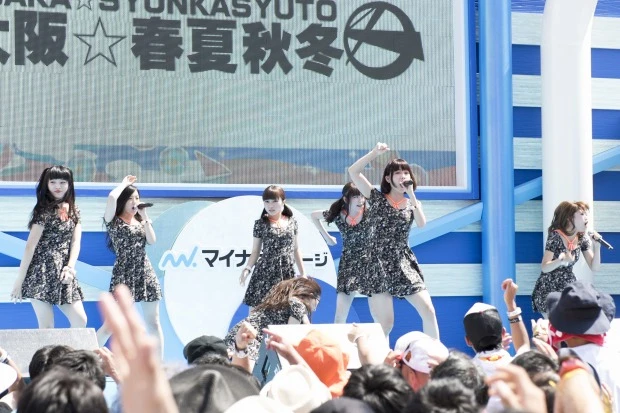 2015年のTIFで「見つかった!」と話題になり、大きな結果を残した“しゅかしゅん”こと、大阪☆春夏秋冬。1曲目の『C’mon!』から、かき鳴らされるロックサウンドと「オーマイジョーイ!ジョーイ!」と叫ぶメンバー。さらにメインボーカルのMAINAが歌い出した瞬間、フジテレビ前の空気がガラっと変わった。