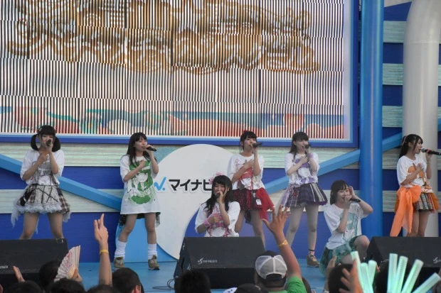 「みんな、たくさん来てくれてありがとう! でも、なんで、あんな後ろの冊のほうにいるの?」と、志田友美がステージから遠くに離れた無銭エリアにいる客を指差して言う。すると新井ひとみが「きっと大人の事情だよ」と、悟ったようなコメント。これには客も苦笑い。続いて、「次の2曲は、ノリノリの曲だよ! みんな私たちについて来れるー?」という言葉通り、『灼熱サマー』と『GOGOサマー!』を披露。お互いがアイコンタクトをしながら、両手を広げ、手の平をヒラヒラと舞わせながらアオる。楽しい! これぞ夏だ! これぞサマーだ!