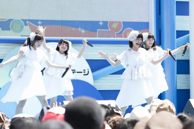 ピピピ…という心地良い電子音が鳴り響く。彼女たちの定番曲『魔法の言葉』だ。サビでは「魔法のこ~と~ばっ!」部分のちょいファルセットが胸をくすぐる。最年少の山崎愛(まな)が、ぎこちなく笑う。神崎風花がパカっと口を開いて笑う。太陽の光に照らされた4人の少女たちーー。白い衣装が光の加減か青く見える。DREAM STAGE後方の壁も青く、まるで少女たちは水の中にいるようだった。パタパタと踊る少女たちは、まさにオサカナだった。