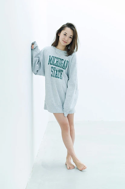 ―大きなスウェットを着て素脚を出しながら、ぺたん座りしているカットですね。自宅でくつろぐ時もこんな感じ?