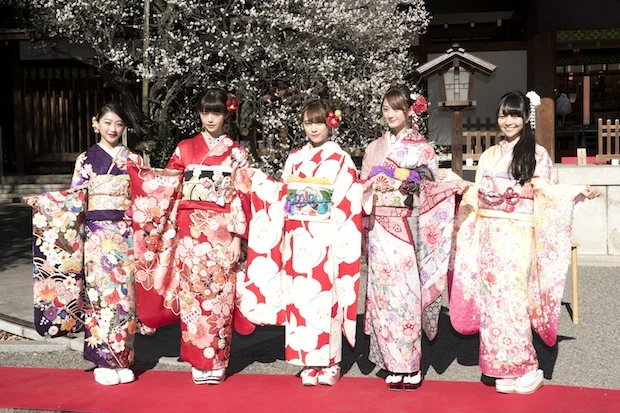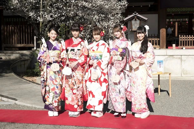 プラチナムプロダクションの新成人による晴れ着お披露目会が1月12日、東京・乃木神社で開催された。左から田辺かほ、鈴木優華、都丸紗也華、加藤雛、神沢有紗