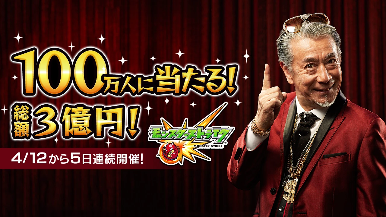 実はこの春、「モンストミリオンくじ」と称し、100万人に総額3億円の賞品が当たる大型イベントが実施されるとのこと! 現金500万円が5人、100万円がなんと20人に当たるとか…ふ、太っ腹すぎる。