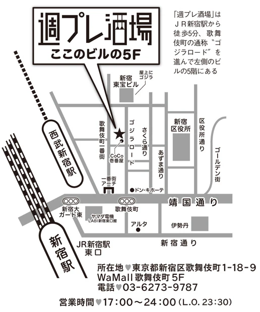 ●週プレ酒場所在地:東京都新宿区歌舞伎町1-18-9 WaMall歌舞伎町5F 営業時間:17:00~24:00(L.O.23:00)TEL:03-6273-9787