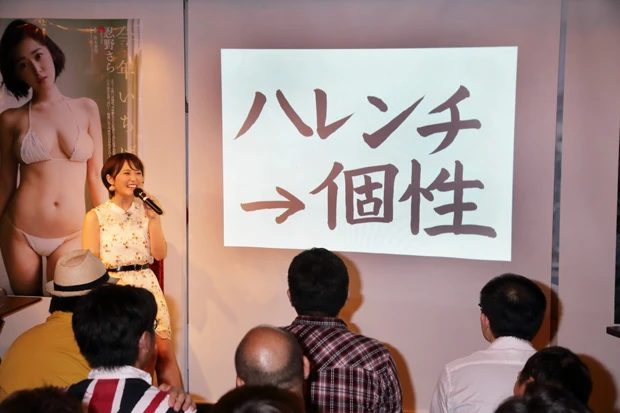 さらに、“グラビアあるある”として「ポロリ」について「意外と水着よりもワンピースのほうがしちゃう」と回答。「こんな衣装はイヤだ」という質問には「気にしないようにしているけど、際どい衣装。一度、撮影中に後ろの建物からお兄さんたちが出てきて、写メを撮っていた時は焦りました」など、撮影秘話を交えて答えた。