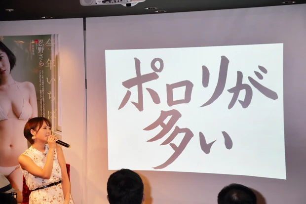 続いて、事前に行なったアンケートをもとにトークが進む。「(グラビアの)目標が週プレに載ること」だったという忍野だが、初撮影では「気合が入りすぎちゃって、前日は眠れなかった」そうで、MCから「さっきの子どもの頃の表情ですね」とツッコまれるほど、完全に引きつった顔に。