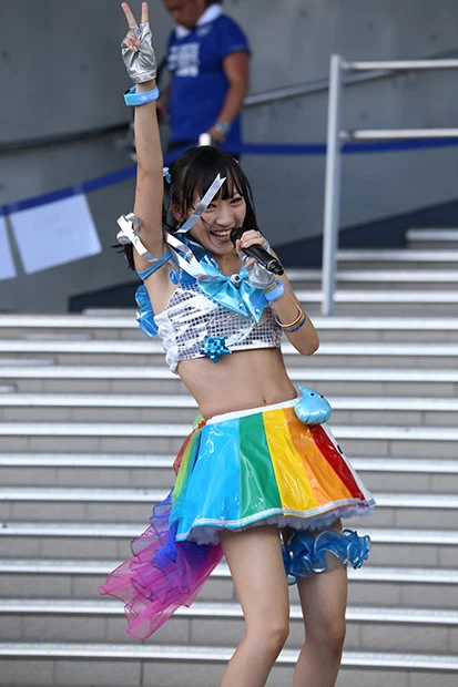 FESTIVAL STAGEといえばガンダム広場とも言われているが、現在建造中のユニコーンガンダムを前に「ガンダム(以前のRX78-2)撃墜記念ステージ」と銘打ち1曲目『恋のガトリングシールド』から新曲『3×ザ・ライド』をスピード感たっぷりに「3倍速く!3倍熱く」と熱唱。最後の1stシングル曲『キラキラアオゾラ』では会場全員で「ジーク・ジオン」コールが沸き起こり、建設中のガンダム像に向かってケチャを起こすなど非常に楽しいステージで観客を魅了した。