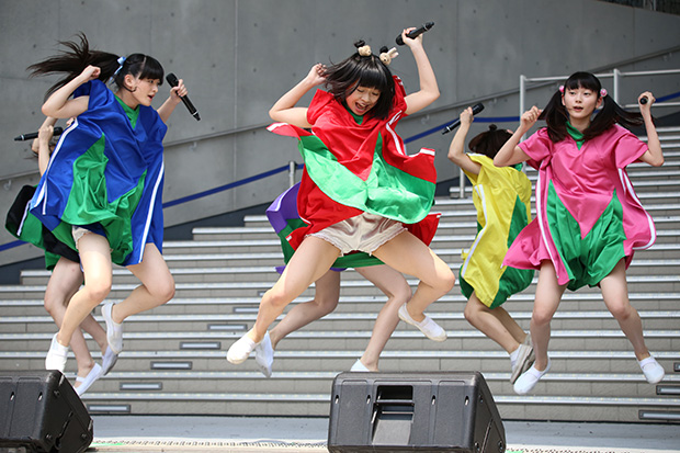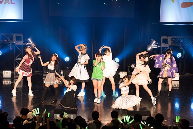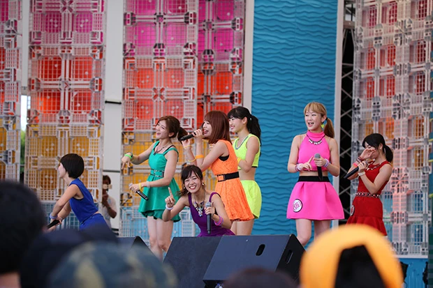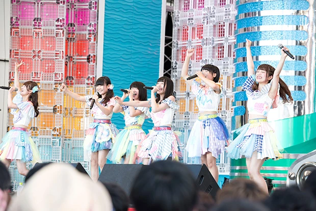 『アッパーレー』から7人体制としてはラストのTIFステージがスタート。佐保明梨(さほあかり)、関根梓、森咲樹(さき)、古川小夏、新井愛瞳(まなみ)のメンバー全員が歌い上げ、サビでは手がちぎれそうな勢いで拳を空に突き上げた。ステージの端から端まで駆け回る、ハードでパッショナブルなパフォーマンスに拍手と「いいぞー!」という声援も。続く『ジャンパー!』は爽やかな夏らしいサウンド。新井の「おまえら全員、もっとこいよ!!」という掛け声で、さらに会場はヒートアップ!