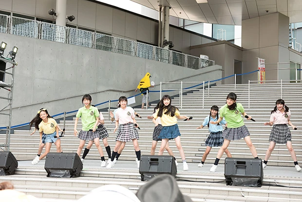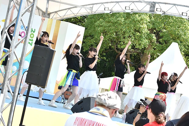 続く、『君にコミット』はゆるやかな曲調ながらも、会社員の苦悩を歌った歌詞は会社勤めを一度でもしたことがある人ならばハッとするはず。そして最後の1曲は『夢があるから』。CDデビュー曲であり、アイドルらしいキャッチーなメロディでステージ横にある大階段に座っている観客の心までも掴んでいた。その証拠にサビのタオル回しはフリーエリアに座り込んでいる人々も笑顔で参加! 愛され力の高さで会場全体を盛り上げていた。
