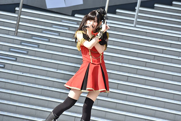真っ赤な衣裳で登場した空野青空。彼女は全国選抜LIVE、北陸ブロックにおいて優勝を果たし、今回の出演を勝ち取った。昨年は「ナツ☆イチッ!オーディション」のファイナリストとなったことでも注目を集めているソロアイドルだが、大のガンダム好きでこの日の真っ赤な衣裳もどこで見た憶えのあるデザイン。