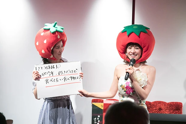 来栖 私は途中で出てくれた山口めろんちゃんと一緒に着ぐるみが着られたことですね。めろんちゃんの特技の“メロン占い”をお手本にして、イチゴのかぶりもので“来栖イチゴ占い”ができたのが本望です。