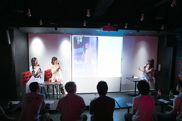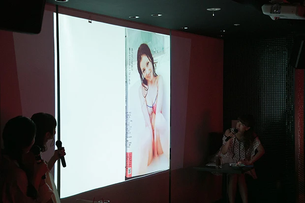 まずはお客さんとの乾杯コールから幕を開けたこのトークショー、最初のコーナーは“懐かしの週プレグラビア”大紹介。現在はアラフォーとなった3名がデビュー当時のグラビアをスクリーンに映しながら振り返るという趣向だが、ここでスクリーンの操作を任されたかおりポリスが早速、大暴走!