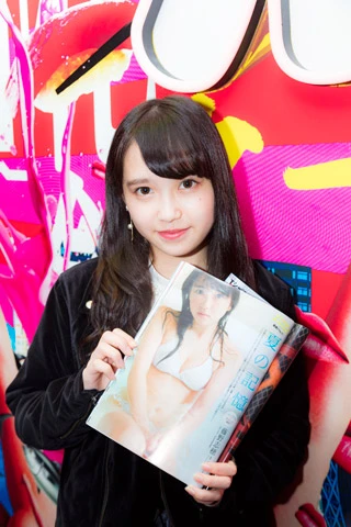 さらに、赤ワンピースや神奈川県の桐花(とうか)園で撮影された制服姿などのグラビア画像が写し出され、「このしゃぼん玉を吹いている写真は周囲もしゃぼん玉でいっぱいにしたんですけど、側からみたらすごい光景だったみたいで(笑)。あと、制服を着てプールに浮いてる写真は、実はプールではなく、ジャグジーバスのような施設なんです」と、撮影の舞台裏を説明。