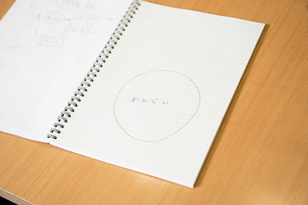 寺口 このノートに書いちゃっていいんですか? こんな感じですよ?(ノートには◯の中に「めんどい」の文字)