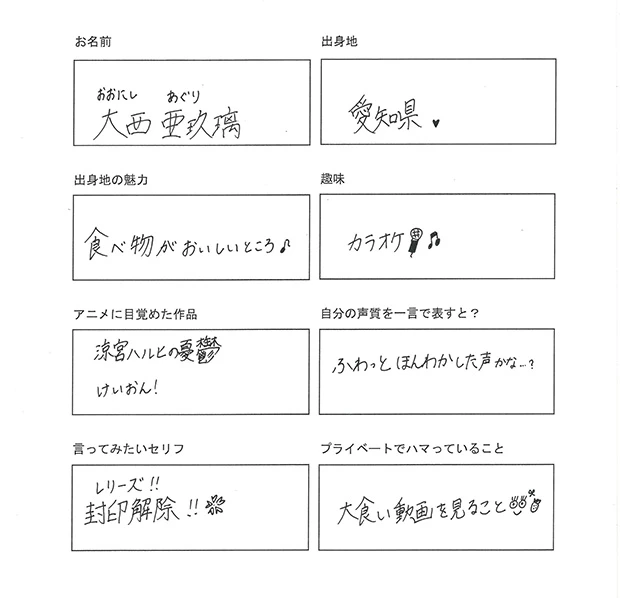 大西亜玖璃(おおにし・あぐり)1997年5月2日生まれ 愛知県出身 ◯「第13回全日本国民的美少女コンテスト」ファイナリスト。『ラブライブ!スクールアイドルフェスティバルALL STARS』虹ヶ咲学園のメンバーとして出演中
