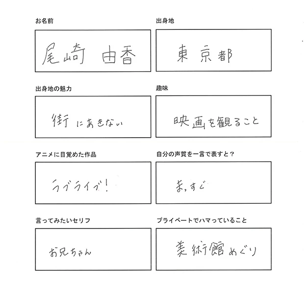 尾崎由香(おざき・ゆか)5月15日生まれ 東京都出身 ◯『私たち、らくろじ部!』でデビュー。現在、『おしゃべりオジサンと怒れる女』のナレーションを担当