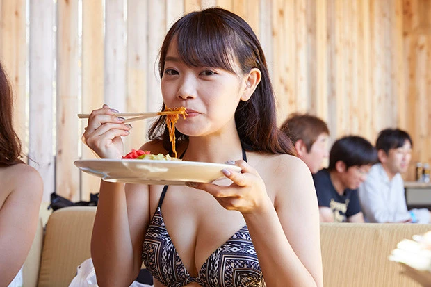 「海に行くのは3年ぶりぐらい」とは思えないほどの"海の家の美人お姉さん感"を漂わせているのは小林レイミちゃん。海ブランクを感じさせないたたずまいは、地元・九十九里浜で遊んだという幼少期の経験によるものだろう。