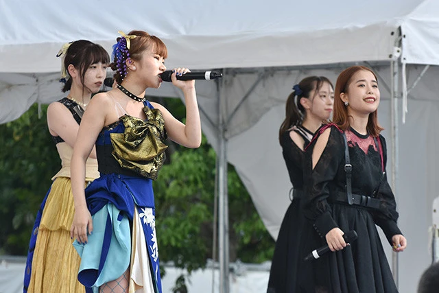 夕暮れにぴったりの切なげなインスト・ナンバー『海に纏わる言葉』が流れるなか、4人がスタンバイ。左右にステップを踏むダンスがカワイイ『夜空を全部』から、息つく暇もなく『New Stranger』へ。軽やかな電子音が、ステージをテンポよく進ませる。神崎風花(かんざきふうか)の弾ける笑顔が眩しく、なぜだか切なささえ感じてしまった。