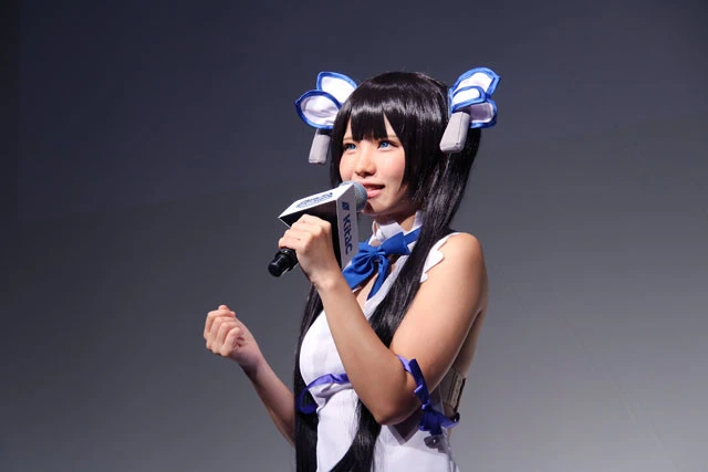 えなこは「プライベートでもコスプレしたことがある」という『ダンまち』のヒロイン、ヘスティアのコスプレ姿で登場。ヘスティアを作品の象徴的存在にさせた胸の"青い紐(ひも)"も、もちろん再現。