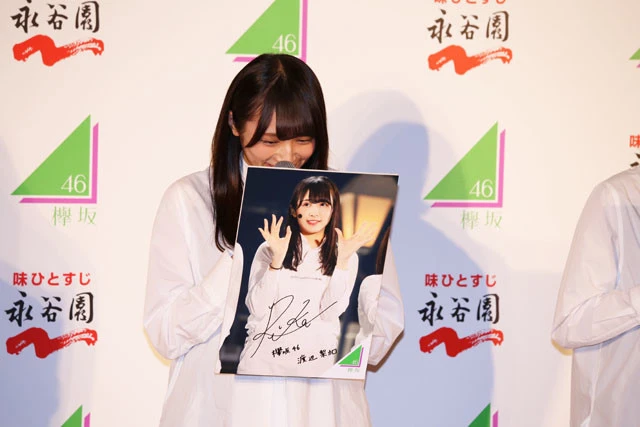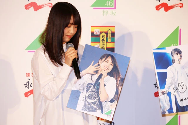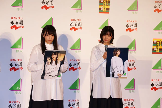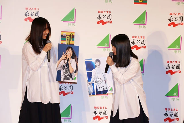 現在発売中のお茶漬けパックには、夏のアリーナライブツアーの画像を使ったライブフォトカードを同封。菅井は「汗で前髪が星のような形になっている」と自身のカードについてのマニアックな見どころを紹介。さらに長濱のカードについて、「パフォーマンス中の眼力がかっこいい」と話した。