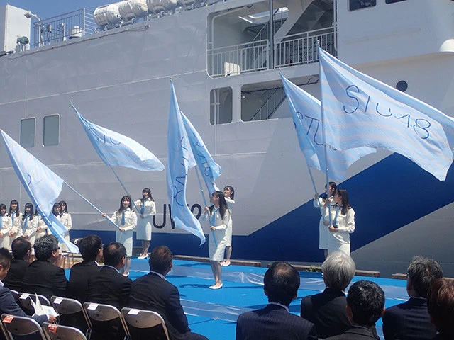 瀬戸内7県(香川、徳島、愛媛、兵庫、岡山、広島、山口)を拠点に活動するアイドルグループ・STU48がライブ会場として使用する劇場専用船「STU48号」が、5月11日、四国では初となる香川県・高松港に到着。同日、記念式典が行なわれ、県知事や市長らおよそ100名が出席した。